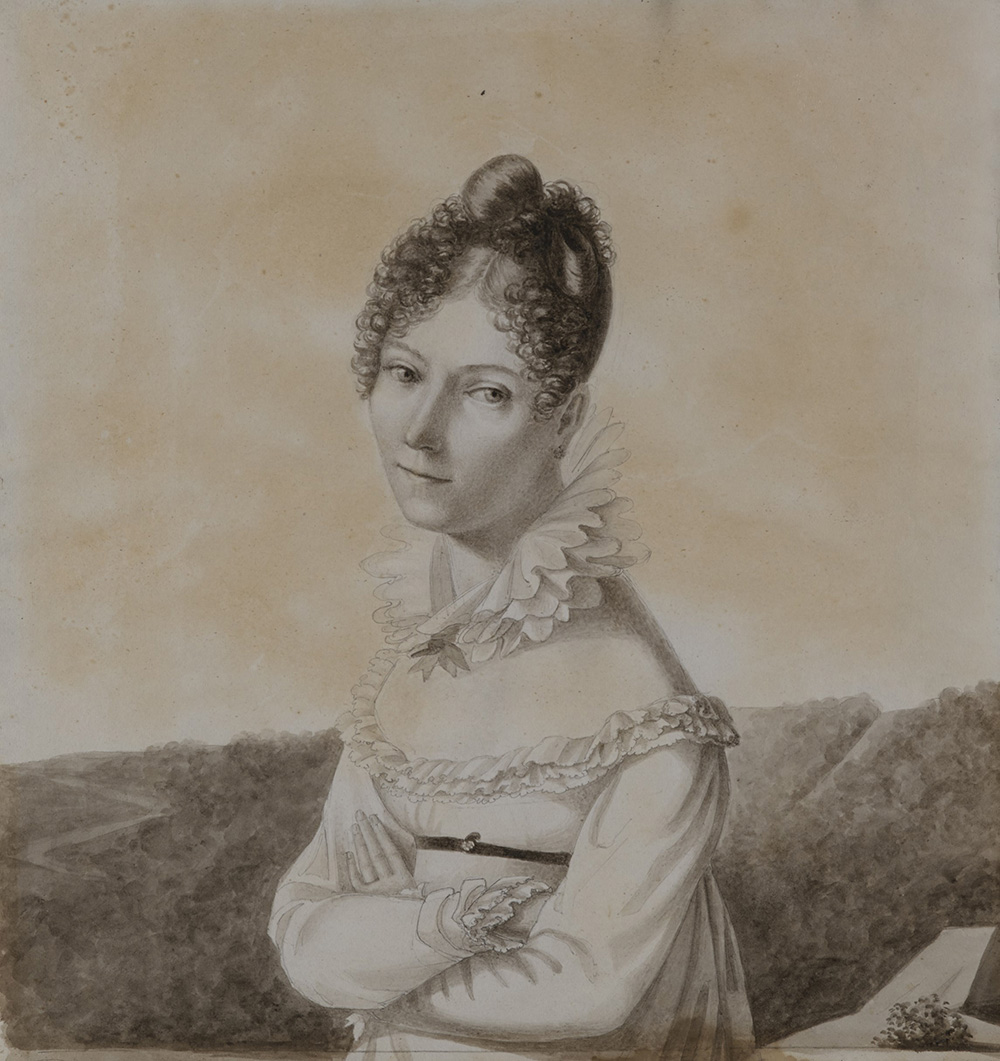 School of the 19th century "Portrait of a Young Girl in a Landscape" pencil and watercolour on paper (cm 21x19.5) Framed (defects)