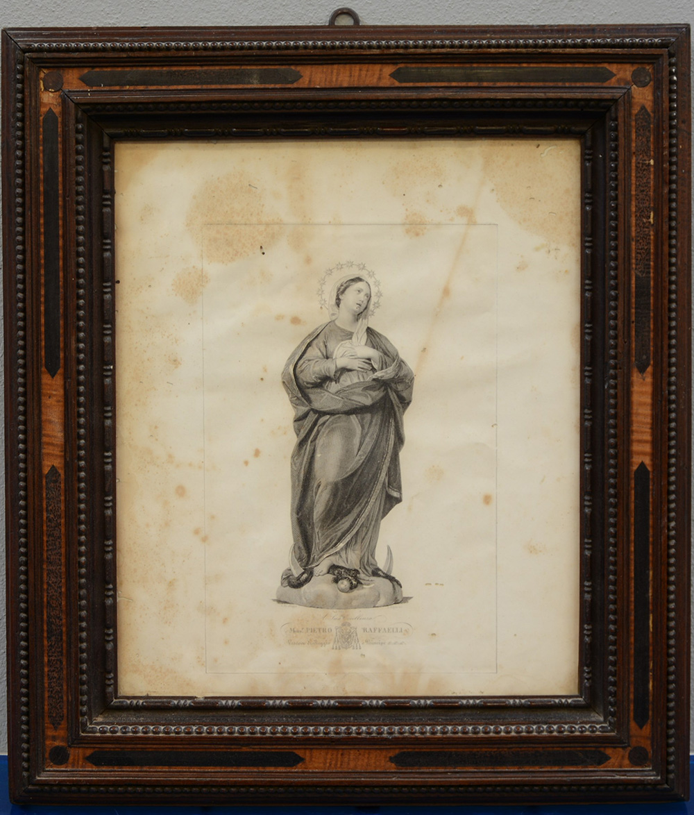 Cornice del sec XVIII decorata da intarsi geometrici e profili perlinati (luce cm 38x32) contenente una stampa (difetti)