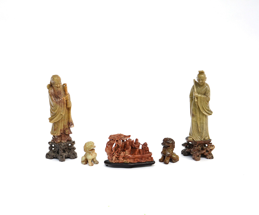 Gruppo di sculture in pietra dura (due cani di Fo, due figure e un gruppo con base in legno