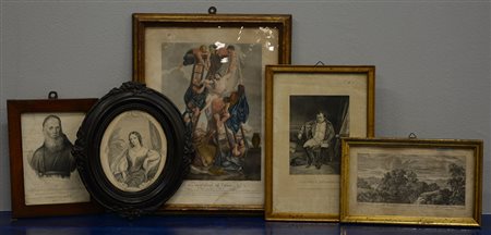 Lotto composto da quattro cornici rettangolari e una ovale in legno ebanizzato contenenti stampe di diverse epoche e soggetti (difetti)