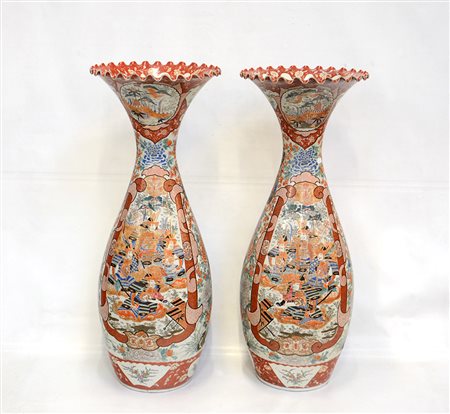 Coppia di vasi in porcellana stile Imari decorati con figure (uno con restauro alla bocca)