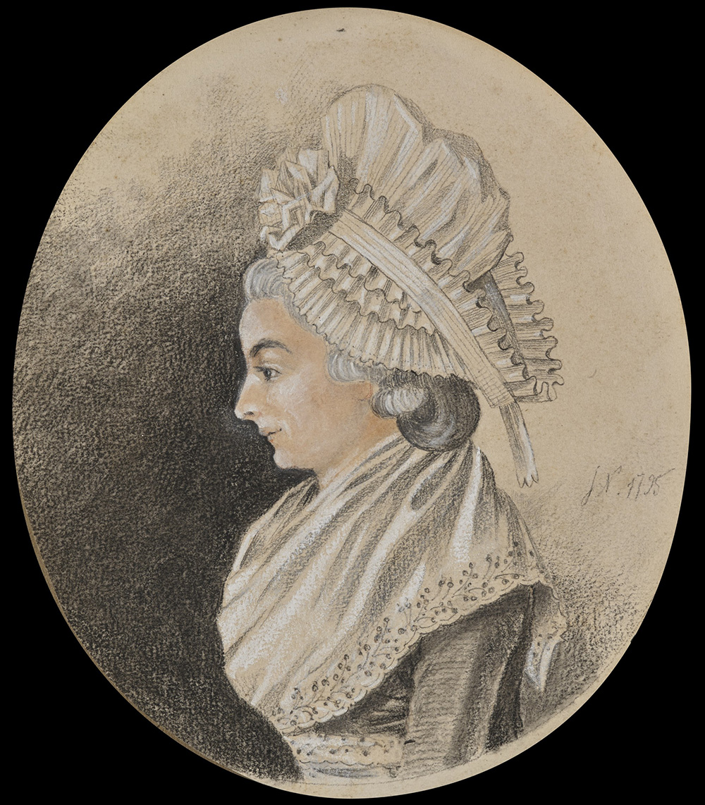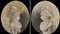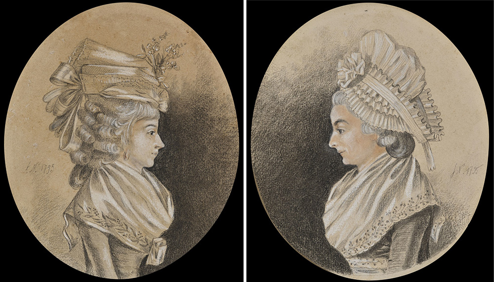 School of the late 18th century "Female Profiles" pair of mixed media on oval paper (cm 19x16) Initialled and dated 1795. Framed (losses)