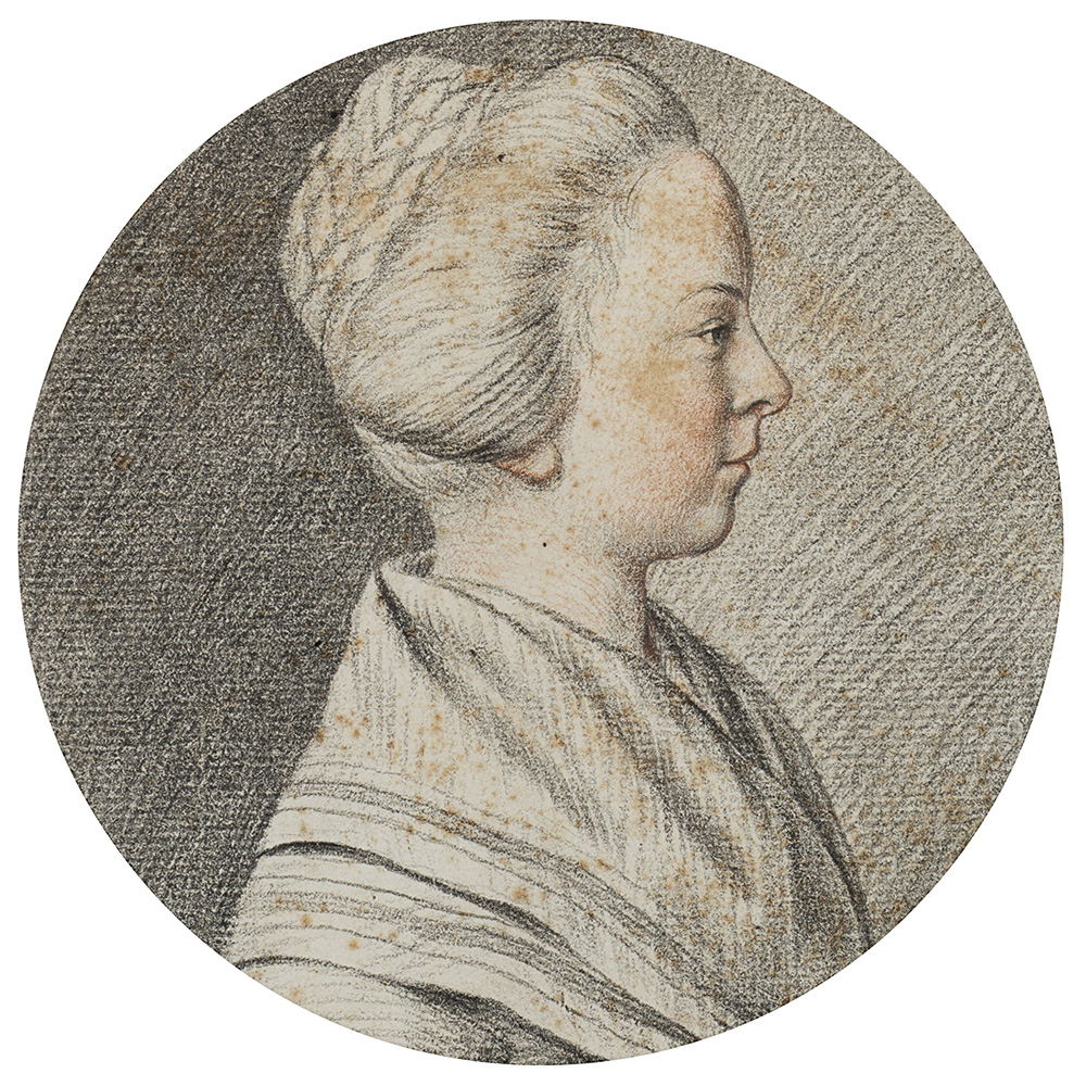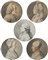 Scuola del sec. XIX "Ritratti di profilo" cinque tecniche miste su carta tonda, di diverse dimensioni (d. da cm 15,5 a cm 19) In cornici dorate (difetti)