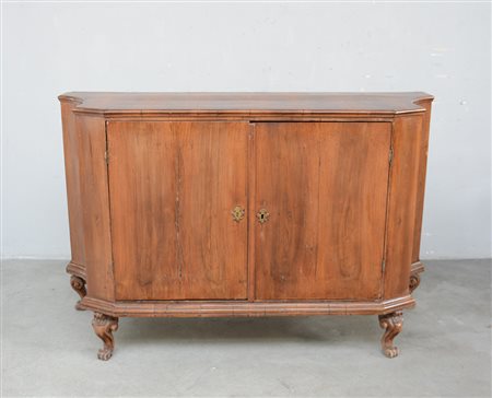 Antica credenza di forma scantonata a due ante con piano e fianchi di forma sagomata. Piedi mossi intagliati. Sec. XIX (cm 155x101x58)