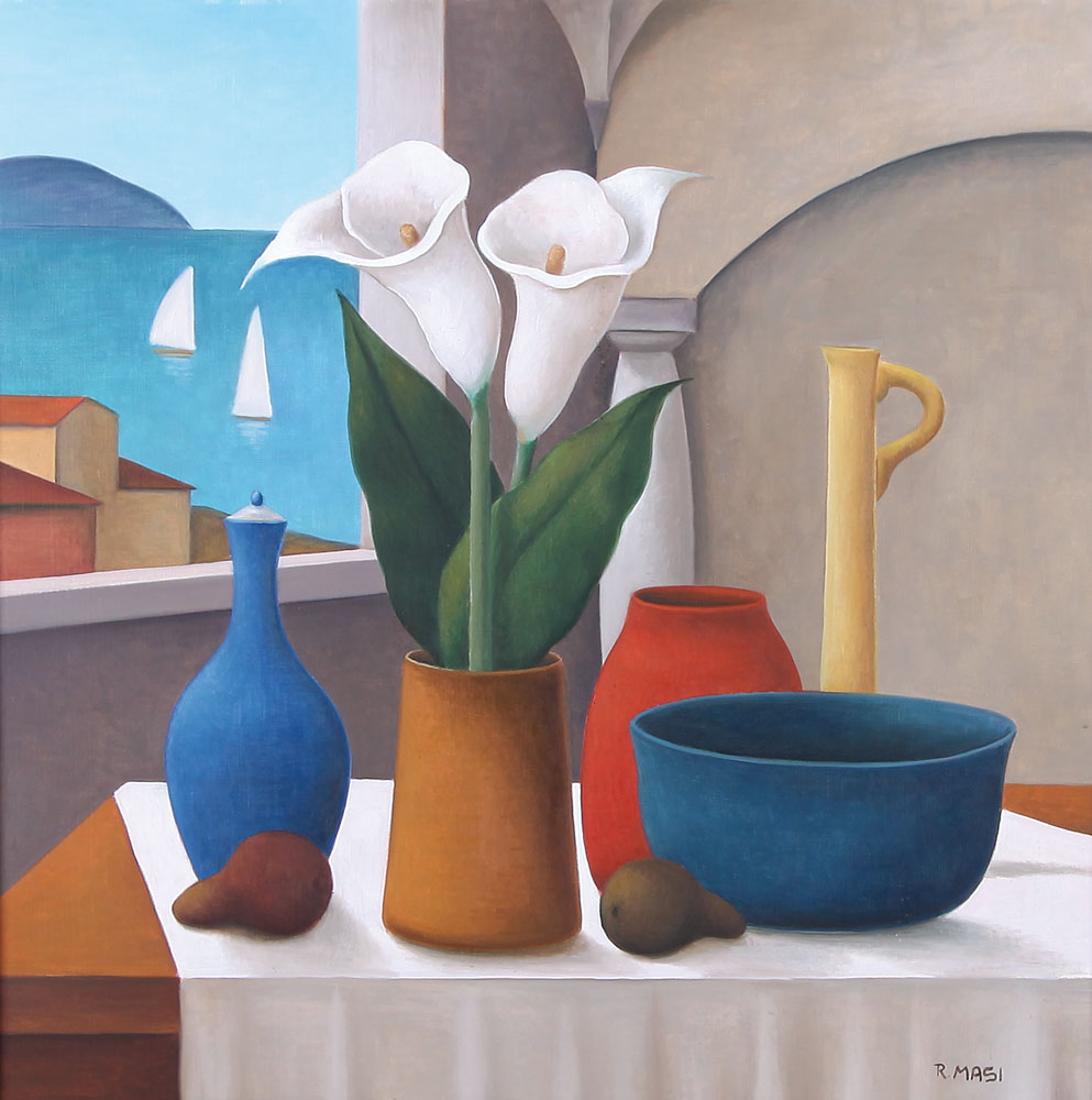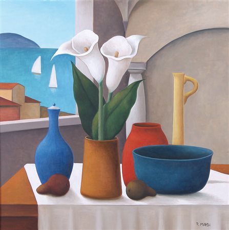 ROBERTO MASI Firenze 26/12/1940 - Firenze 25/11/2011 Le Calle olio su tela cm. 50x50, firma in basso a destra, firma dell'artista e timbro della Galleria Paviglianti (FI) al retro, dichiarazione d'autenticità e archivio dell'artista su foto, certificato d'autenticità della Galleria d'Arte Paviglianiti allegato.