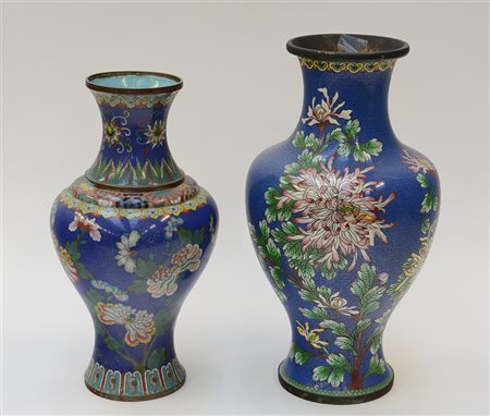 Due vasi in metallo cloisonné con decoro floreale su fondo turchese Cina,...