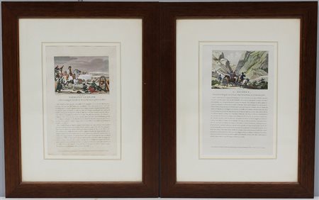 Lotto di due stampe (262 x 165mm) a colori (sec. XIX) con testo in francese sottostante. In cornici.