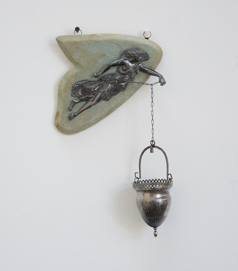 Acquasantiera in argento raffigurante un angelo che sorregge un secchiello marcato Angelo Giannotti. Roma, se. XIX(difetti e mancanze)