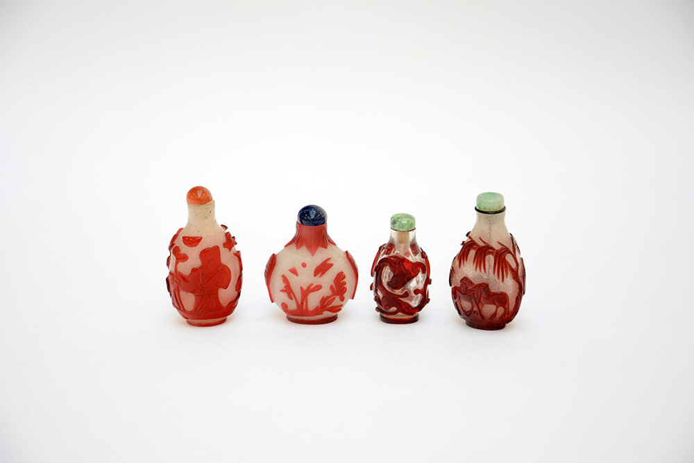 Quattro snuff bottles in vetro con diversi decori e misure, tappini in pietra...
