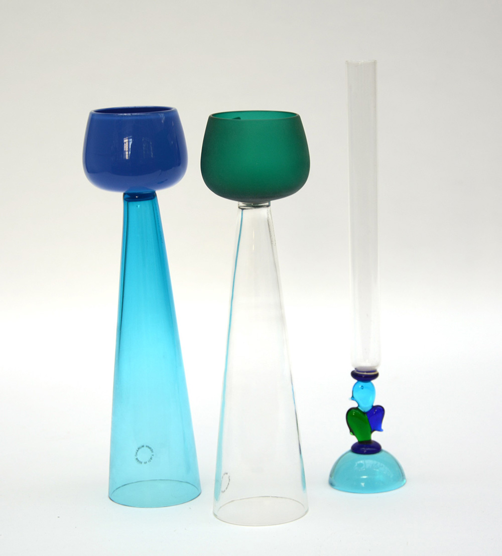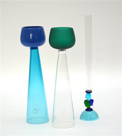Manifattura di Murano, Venini e De Wan, secolo XX lotto di due bicchieri e un vaso in vetro verde satinato, azzurro, blu e trasparente, misure diverse