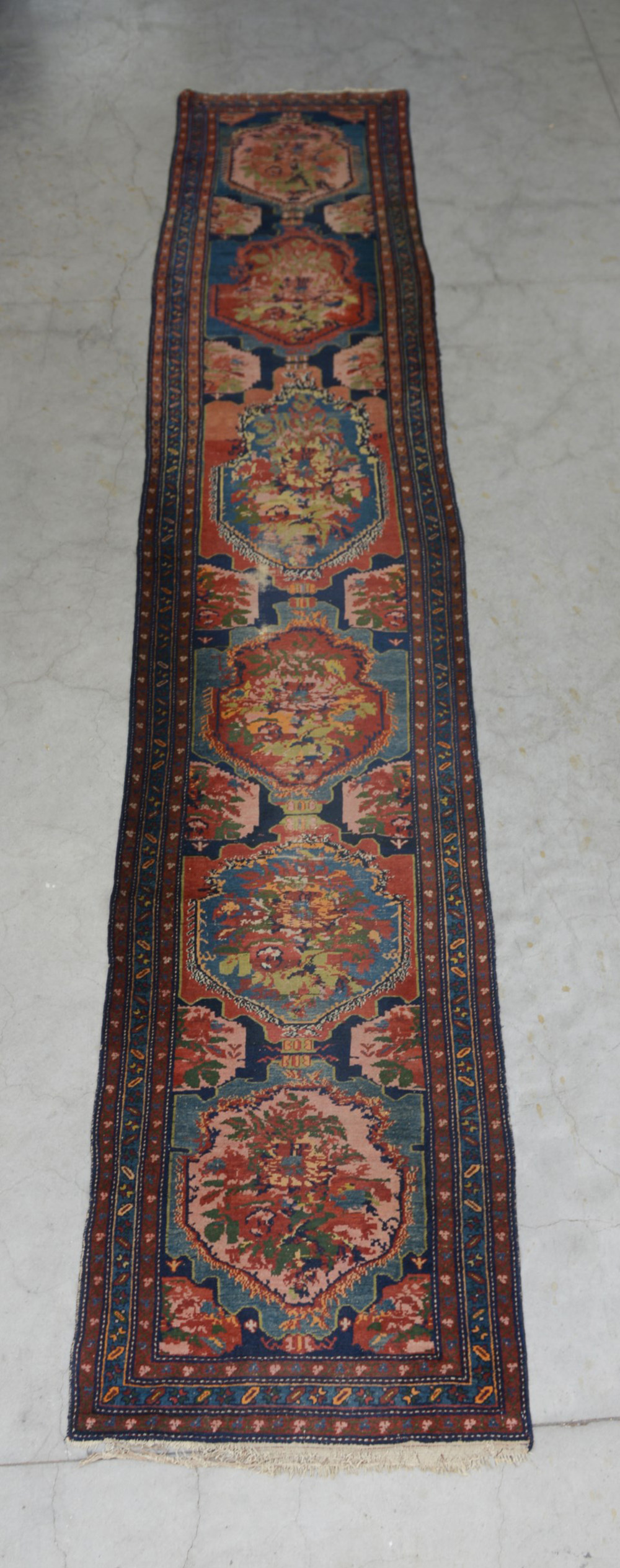 [Tappeti] Tappeto passatoia Bakhtiari. Persia, inizio sec. XX. Disegno a sei medaglioni decorati con mazzi di rose di ispirazione francese in policromia su fondo blu notte (503x95 cm) (difetti e restauri)