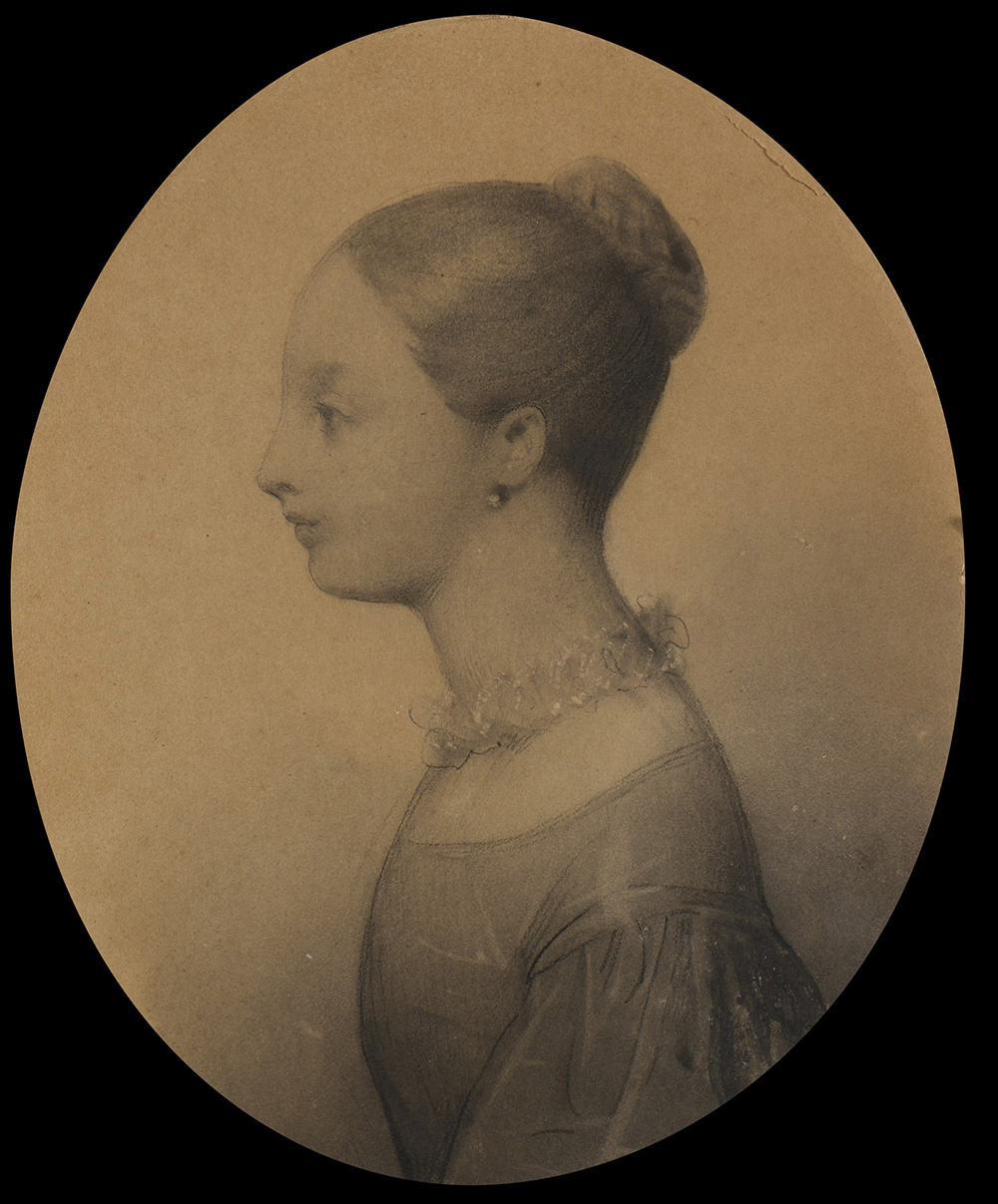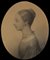 Scuola del sec. XIX "Profilo di fanciulla con collare in pizzo" matita su carta ovale (cm 17x13,5) In cornice rivestita in metallo (difetti)