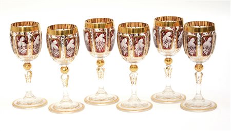 Manifattura di Boemia del secolo XX,gruppo di sei bicchierini da liquore in cristallo molato a tralci di vite con grappoli e dorature (h cm 139)