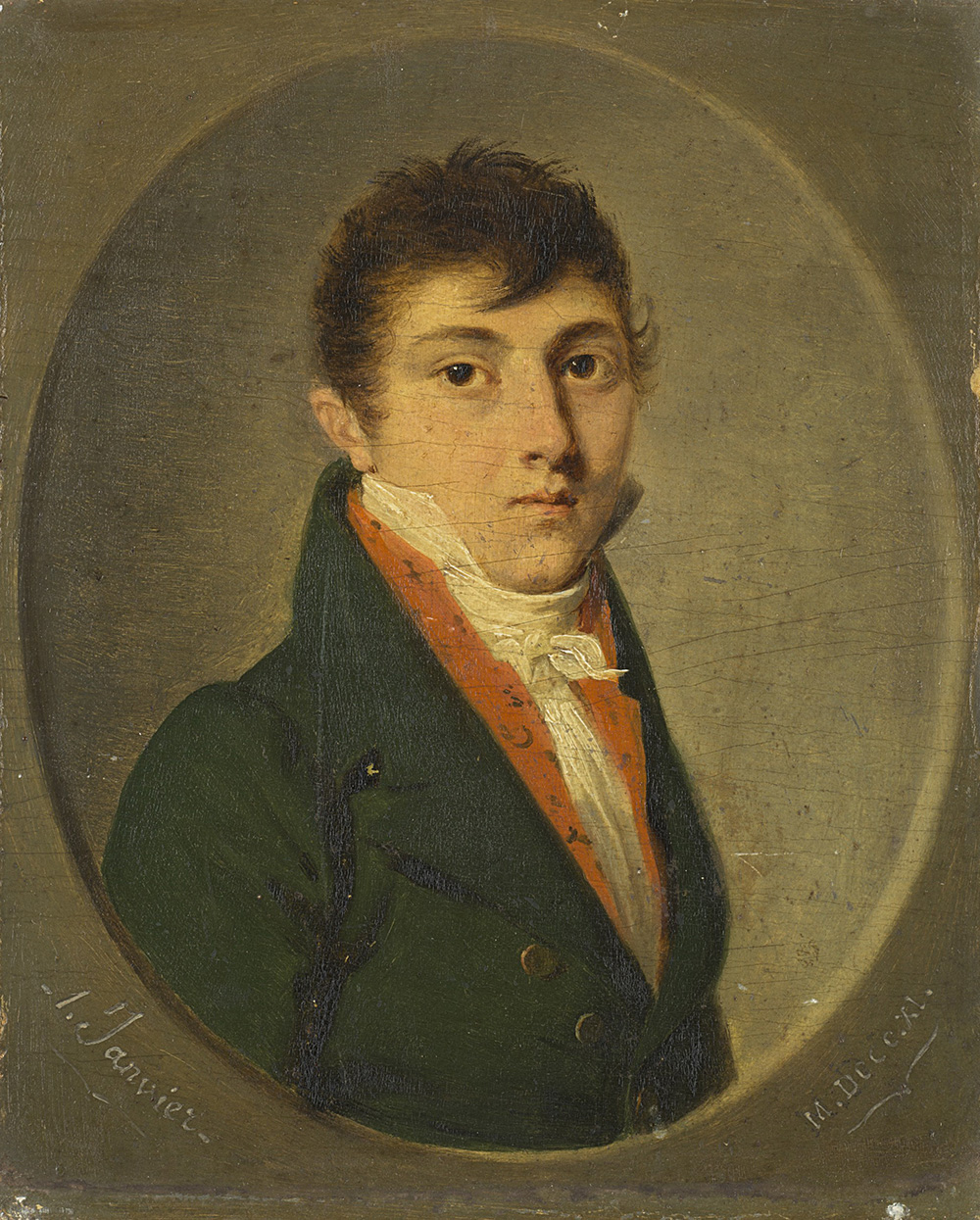 Master of the 19th century "Portrait of a youth wearing a green jacket" oil on canvas (cm18x15) Inscribed "1 Janvier MDCCCXI" Framed (restorations)