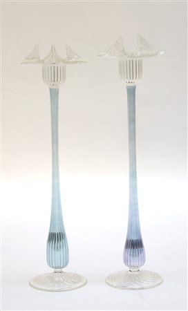 Manifattura di Murano del secolo XX coppia di vasetti portafiori a forma di fiore in vetro trasparente (h cm 32)