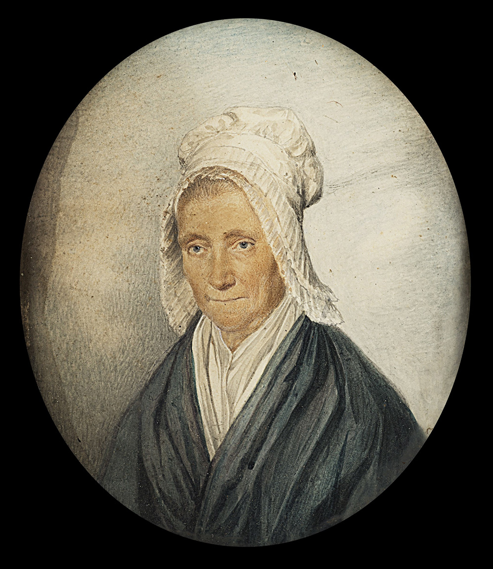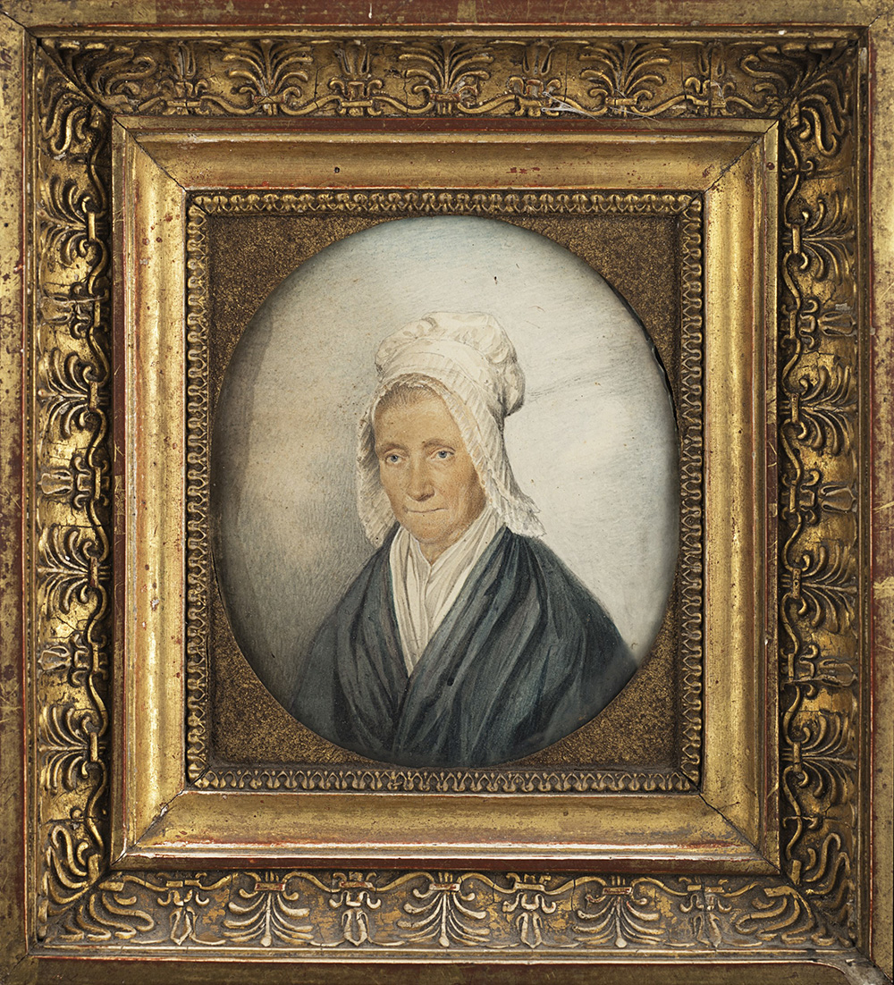 School of the 19th century "Portrait of and Elderly Lady with a Toque" watercolour on paper applied to cardboard (cm 12.5x10) Framed (defects)