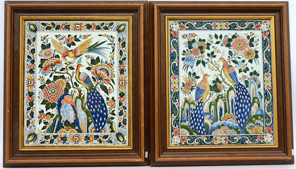 Coppia di piastrelle in maiolica, decorazione policroma dall'antico con uccelli e fiori (cm 36x30). In cornici