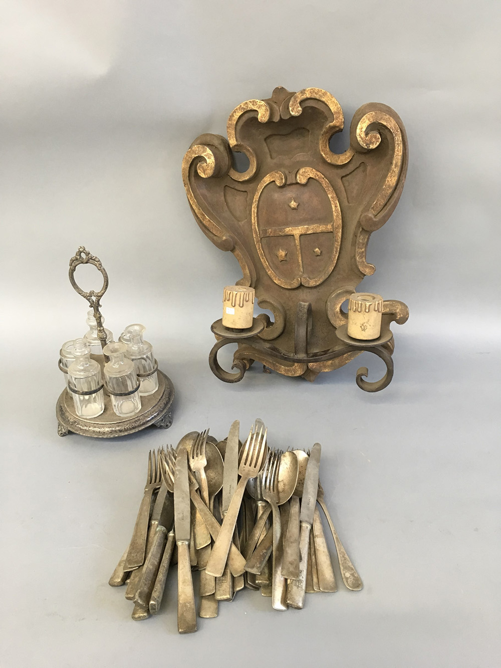 Lotto composto da una applique a due luci con supporto in legno centrato da stemma, un cruet-stand in metallo argentato con ampolle e una scatola con numerose posate (difetti e mancanze)