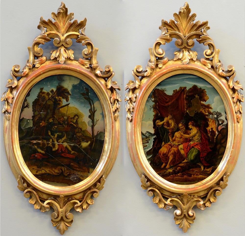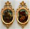 Coppia di incisioni colorate applicate su vetro, raffiguranti scene mitologiche, in cornici ovali in legno, intagliato e dorato, di gusto rocaille (cm tot. 40x75)