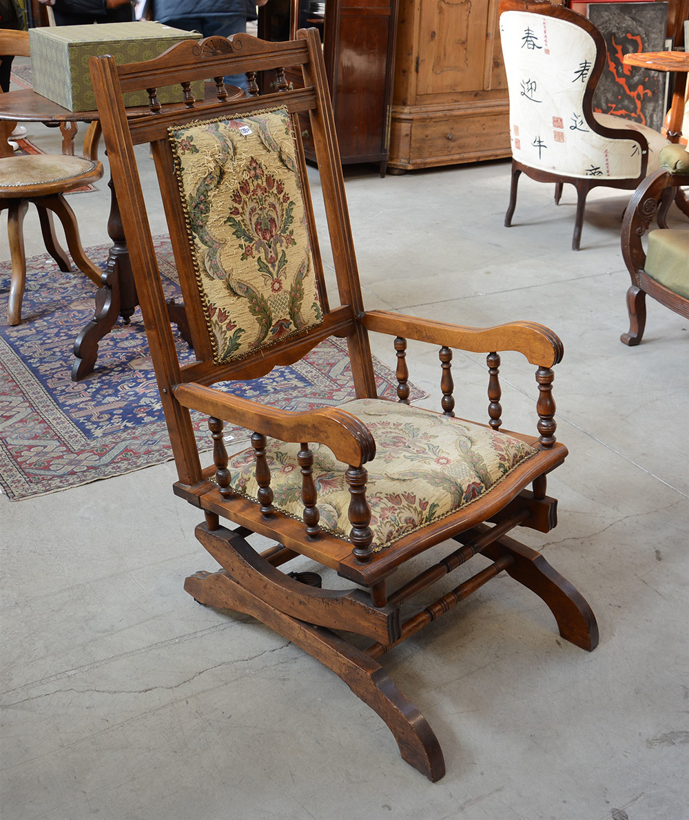 Poltrona a dondolo con schienale e braccioli decorato con colonnine tornite rivestita in tessuto a motivi floreali (difetti)