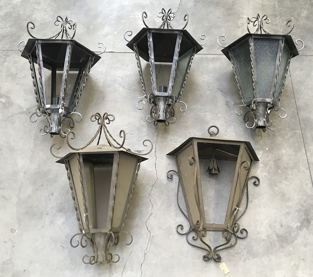 Lotto composto da quattro lanterne esagonali da palo in ferro battuto e una lanterna da parete di fattura simile (h max cm 60 circa) (difetti e mancanze)