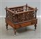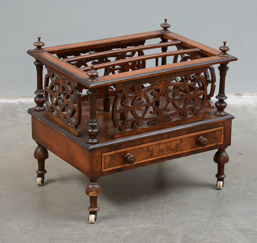 Portariviste in legno lastronato e filettato, fasce traforate, un cassetto nella base, piedi torniti muniti di rotelle, Inghilterra fine sec XIX, (cm 53x43x38) (difetti)