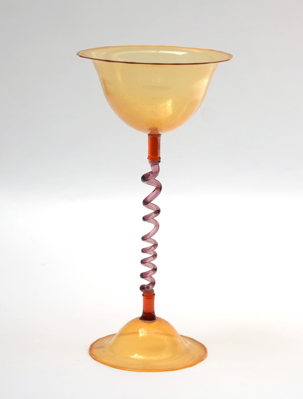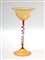 Manifattura di Murano, prima metà del Sec. XX, bicchiere in vetro soffiato paglierino con stelo a torciglione in vetro rosa (h cm 27)
