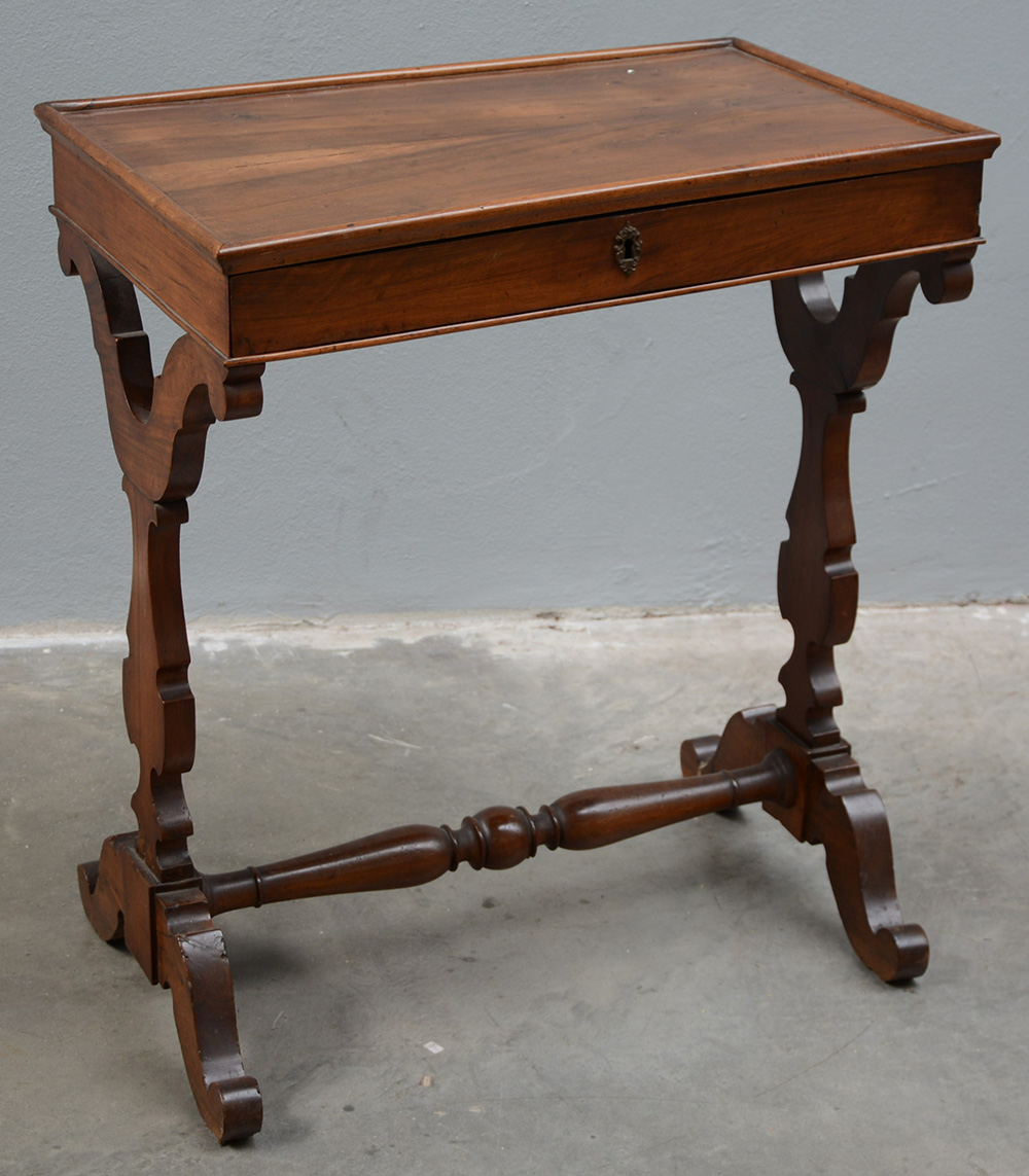 Tavolino da lavoro ad un cassetto montanti sagomati riuniti da traversa...