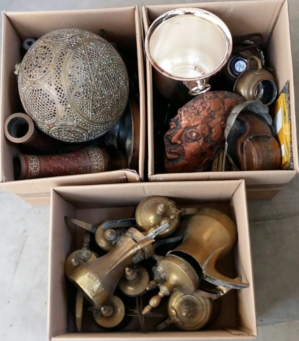 Lotto di tre cartoni contenenti numerosi oggetti per usi differenti molti dei quali di fattura orientale (difetti)