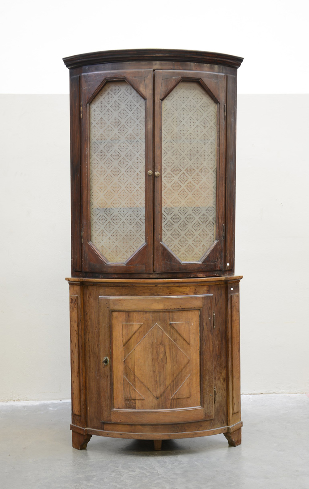 Angoliera a due corpi con fronte convesso, composta da un antico mobile ad un battente in noce ed un'alzata non pertinente a due sportelli con vetri (difetti e restauri)