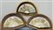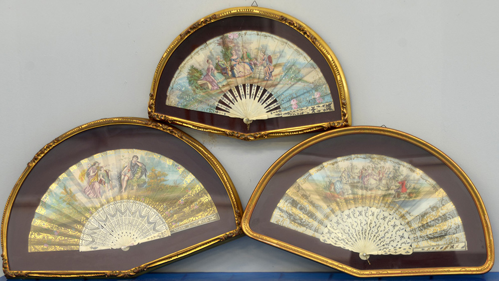 Lotto di tre ventagli con pagine decorate a scene settecentesche e scena mitologica. In teca dorata, misure diverse (difetti)