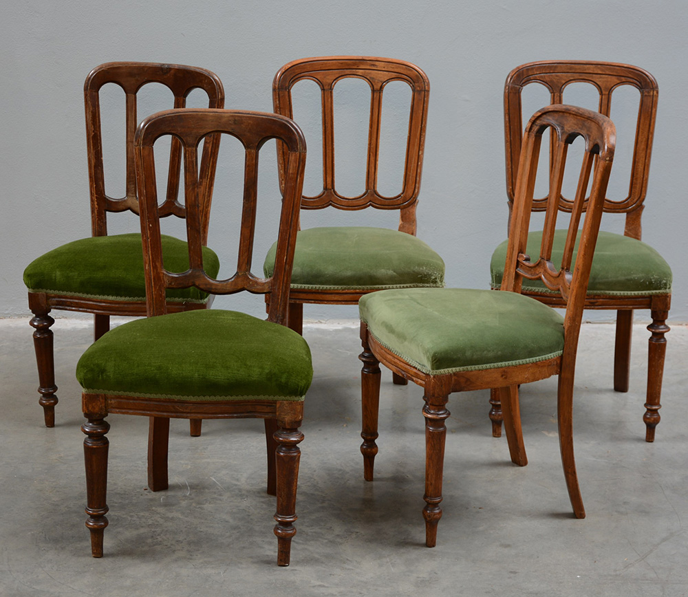 Lotto di cinque sedie con schienale a giorno e gambe anteriori tornite (lievi differenze e difetti)