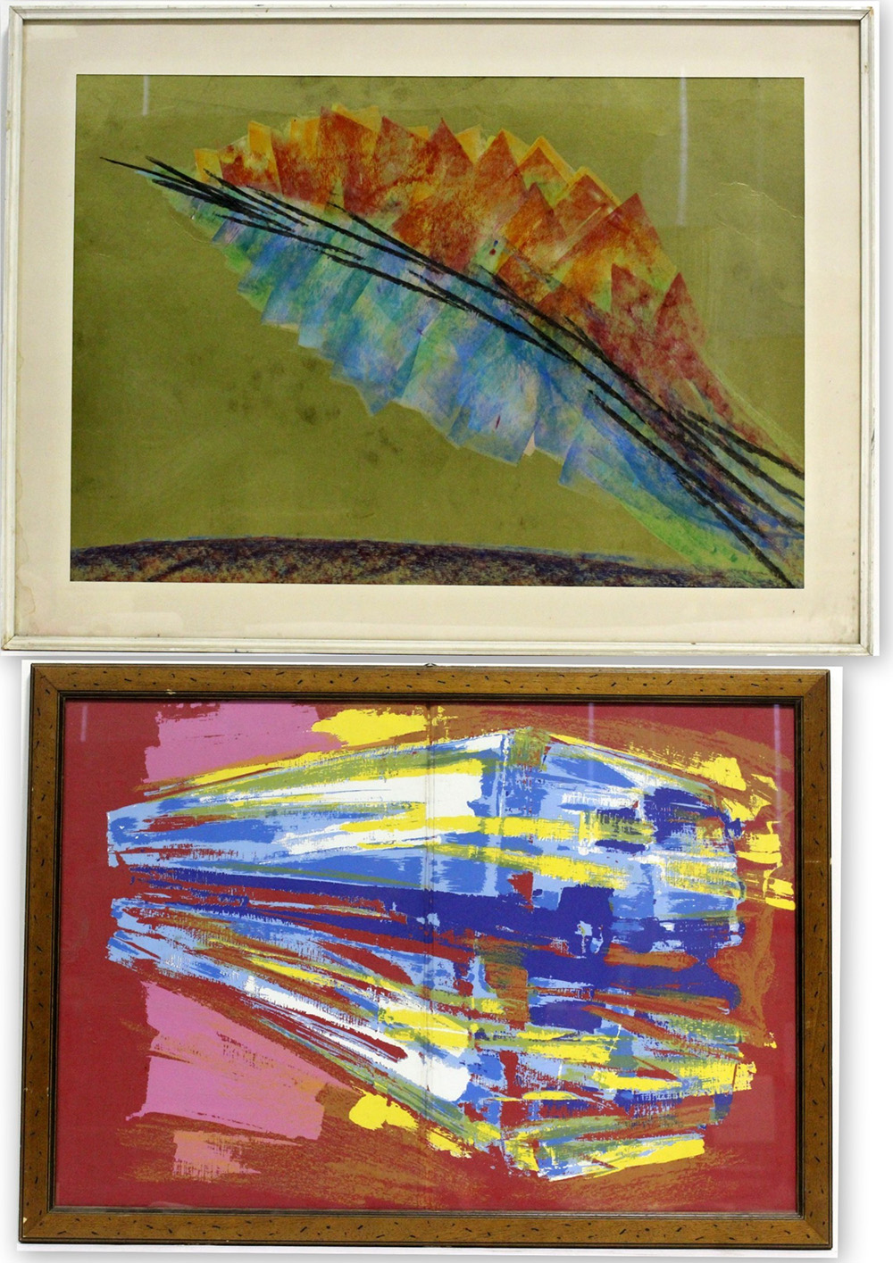 Lotto composto da due serigrafie su supporti differenti raffiguranti composizioni astratte di misure diverse, in cornici (difetti)