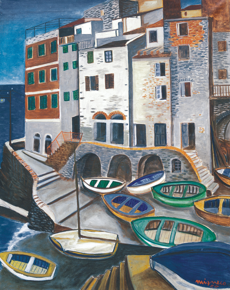 GIUSEPPE MIGNECO Messina 09/02/1908 - Milano 28/02/1997 Rio Maggiore, le Cinque Terre, 1955 olio su tela cm. 90x70, firma e anno in basso a destra, titolo, dichiarazione d'autenticità dell'artista, timbro della Galleria Gavioli (MI) e stralcio di etichetta della Biennale con firma dell'artista parzialmente leggibile al retro.
