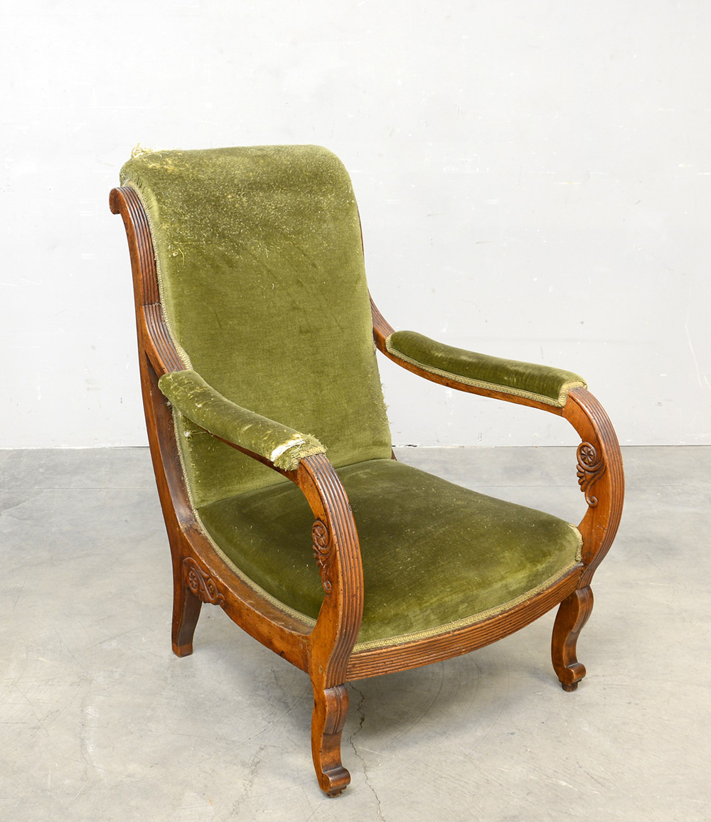 Poltrona con montanti scanalati, braccioli a fasce intagliate. Fine sec XIX (difetti)