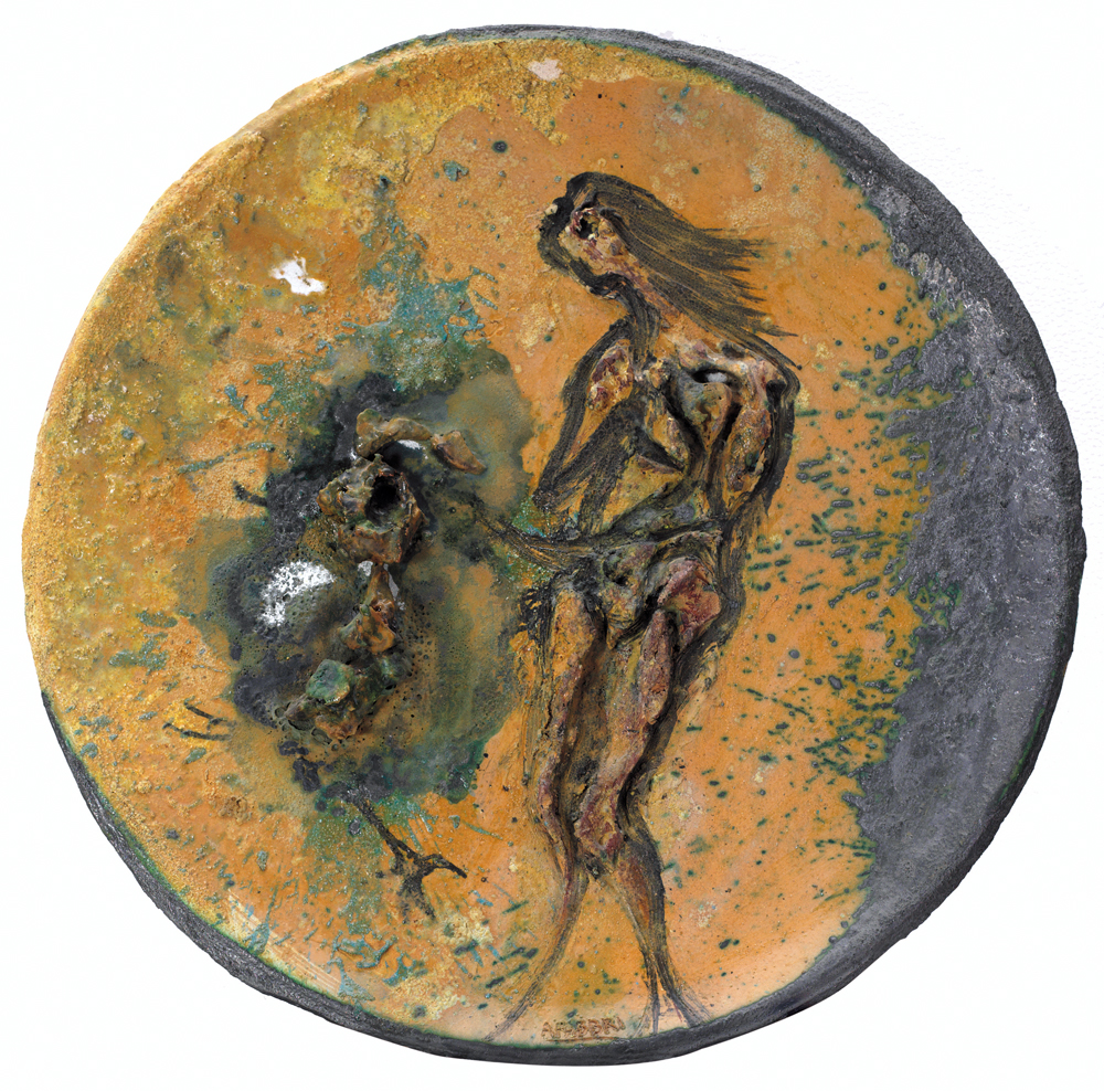 AGENORE FABBRI Barba (Pt) 20/05/1911 - Savona 07/11/1998  Senza titolo  piatto in ceramica policroma San Giorgio Albisola lavorato ad altorilievo diametro cm. 52,5; firma in basso e sul retro, dichiarazione d'autenticità dell'artista su foto.