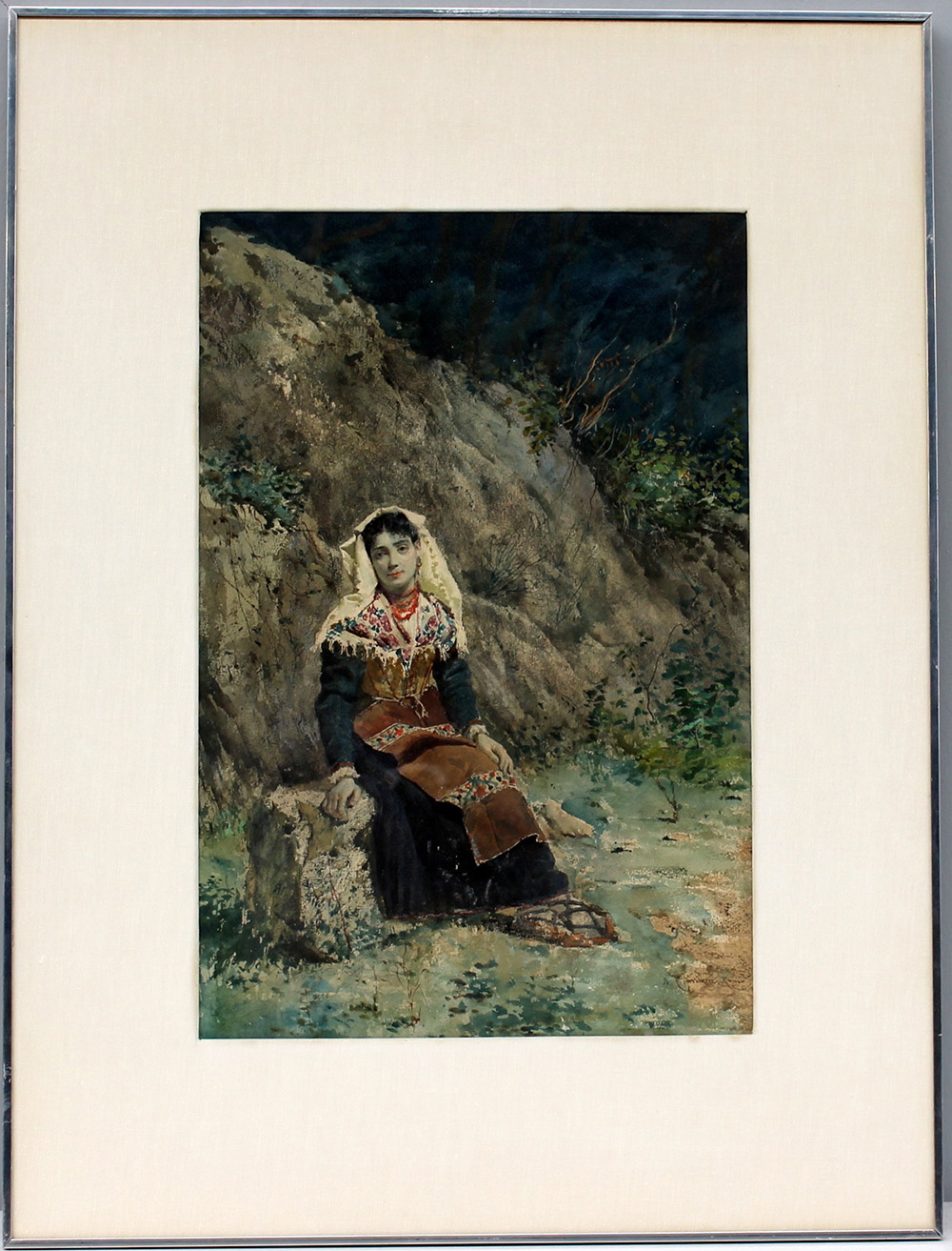 "Contadina assisa", acquerello (cm 45x30) firmato e locato in basso a destra, in cornice
