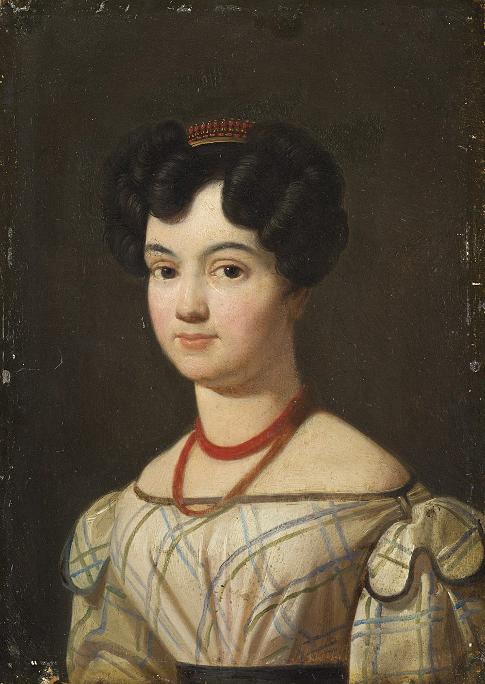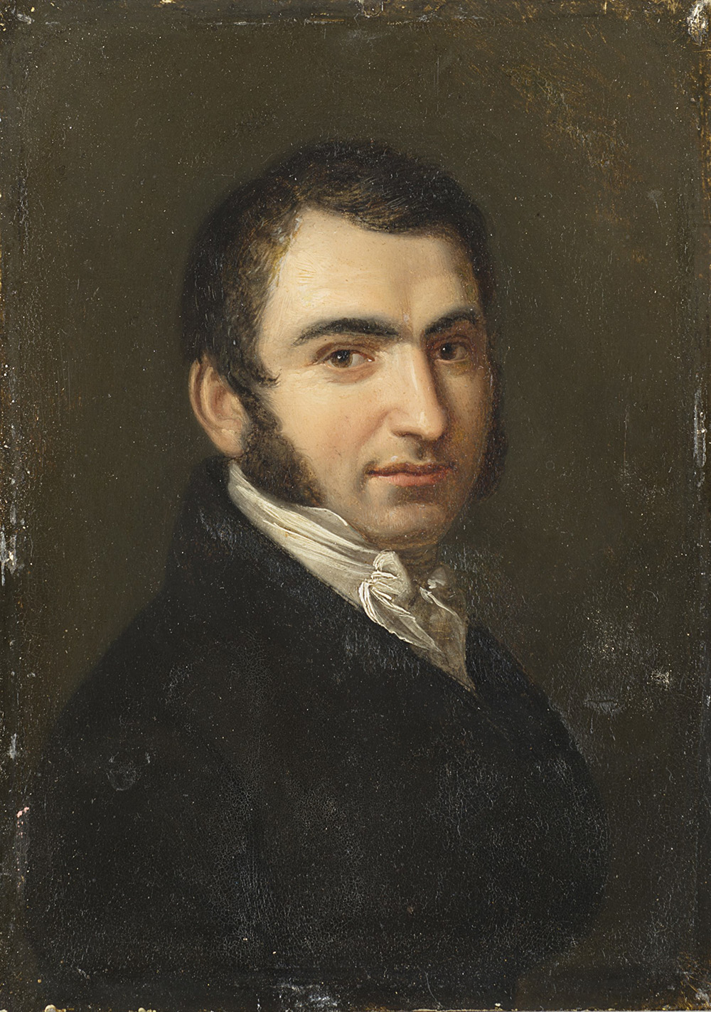 School of the second half of the 19th century "Gentleman and Lady" pair of oils on tin (cm 18x12) Inscribed to reverse: Framed (restorations)