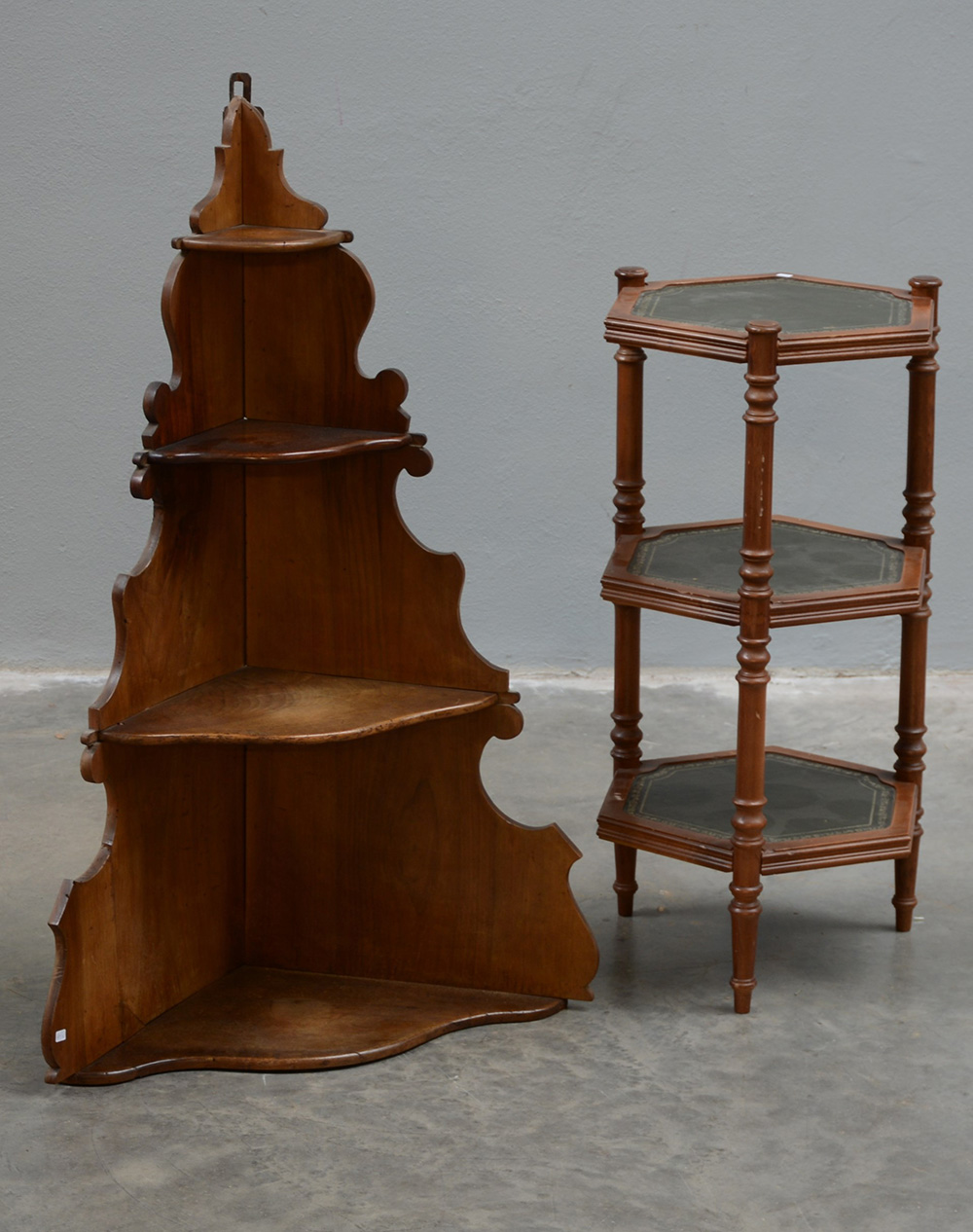 Lotto composto da una mensola ad angolo a quattro ripiani e un tavolino a tre ripiani esagonali (difetti)