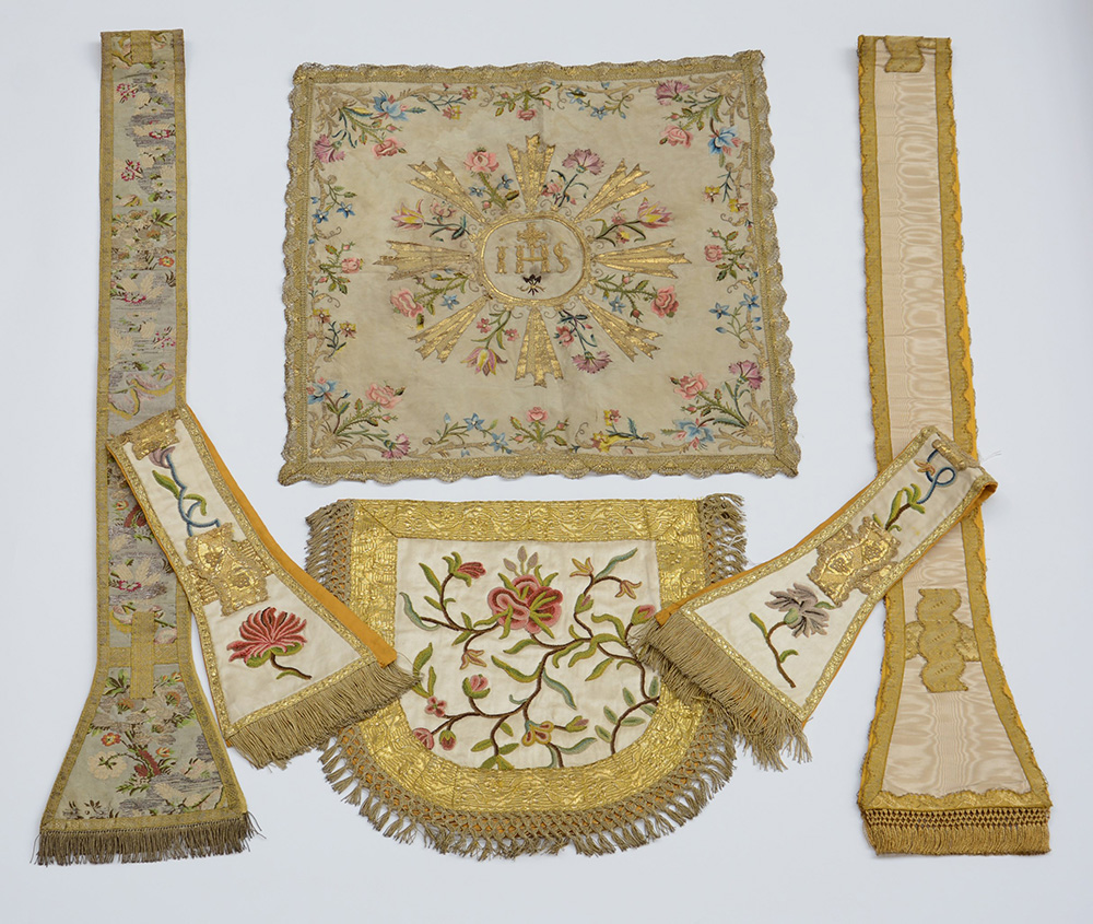 Lotto composto da un copricalice, due manipoli, due stole e un cappuccio di piviale (difetti)