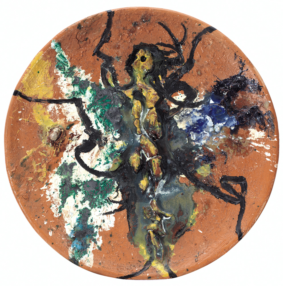 AGENORE FABBRI Barba (Pt) 20/05/1911 - Savona 07/11/1998 Senza titolo piatto in ceramica policroma San Giorgio Albisola lavorato ad altorilievo diametro cm. 52,5; firma in basso, dichiarazione d'autenticità dell'artista su foto.