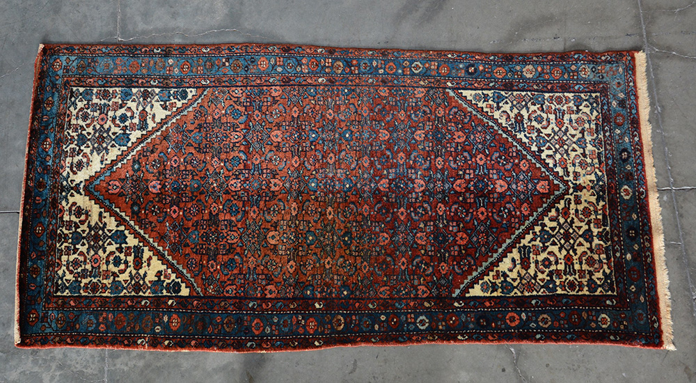 Disegno Herati su campo color mattone e sugli angolari a fondo bianco. Bordura di color azzurro. (cm 201x100) (difetti)