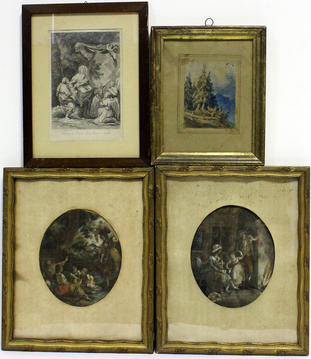 Lotto composto da tre antiche incisioni di cui due acquerellate, e un piccolo acquerello raffigurate abeti; epoche e dimensioni differenti, in cornici (difetti)