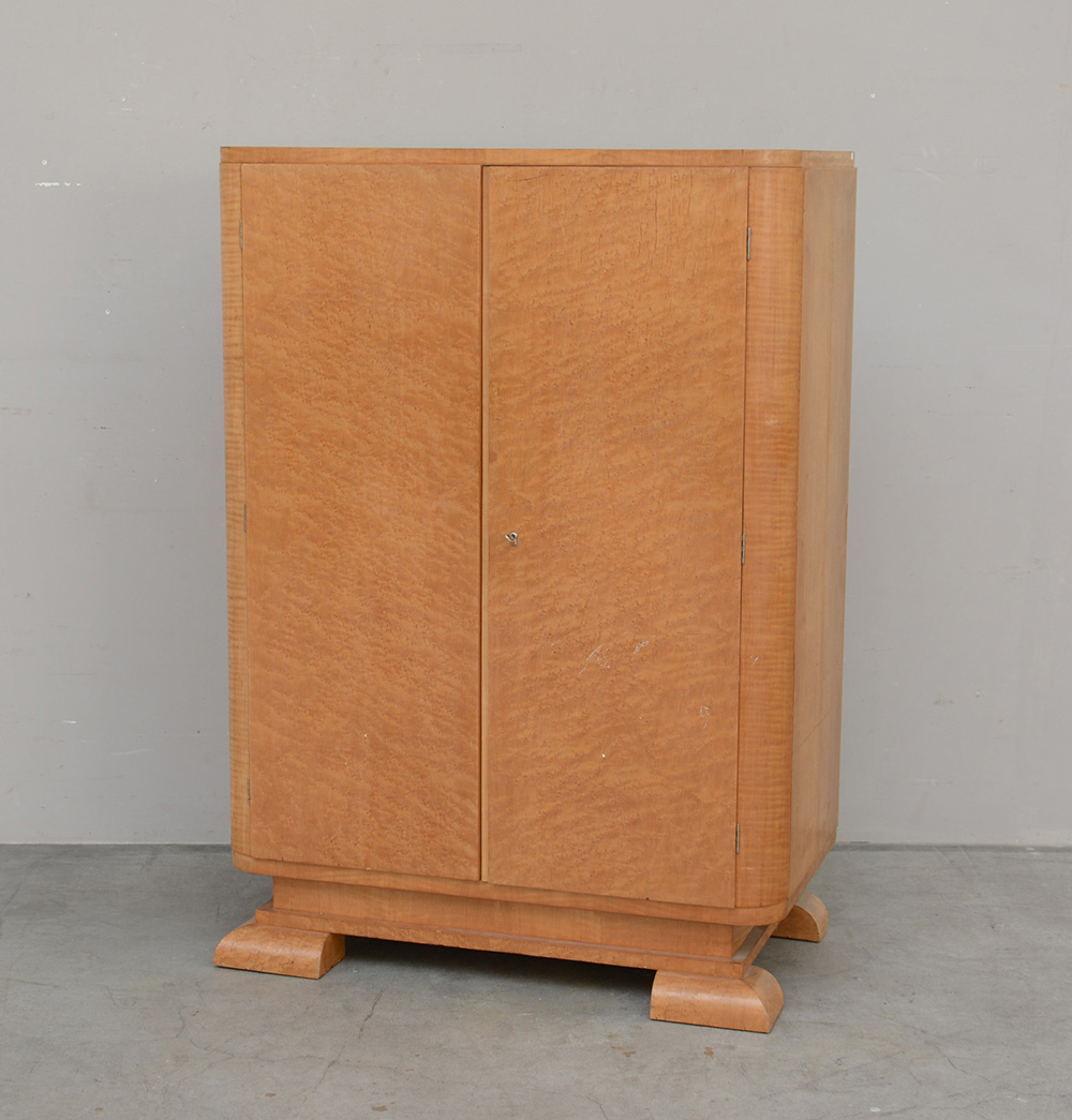 Armadio a due ante di gusto Novecento, lastronato radica e legno chiaro. Italia, sec XX (cm 95x134,5x50) (difetti)
