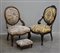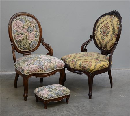 Lotto di due poltroncine da camera e con schienale a scudo, montanti, gambe interiori sagomate e intagliate uniti ad un poggia piedi analogo, fine sec XIX (lievi differenze e difetti)