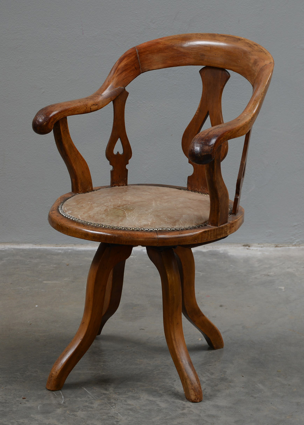 Poltrona girevole con schienale curvo decorato a cartelle traforate, quattro gambe mosse (difetti)