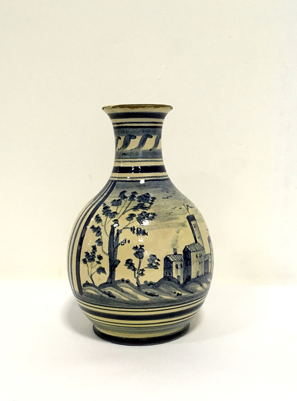 Manifattura di Derura, vaso in ceramica dipinto a paesaggio monocromo blu, marcato sotto la base (h cm 27) (difetti)