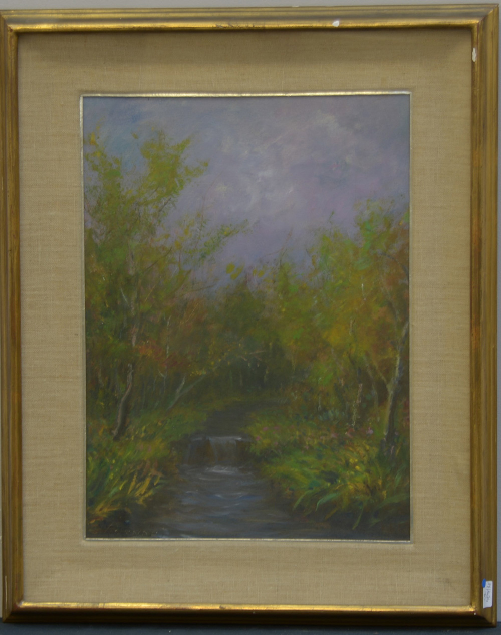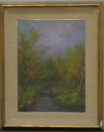 "Paesaggio boschivo con corso d'acqua" olio su compensato (cm 38x27) firmato in basso a sinistra, in cornice