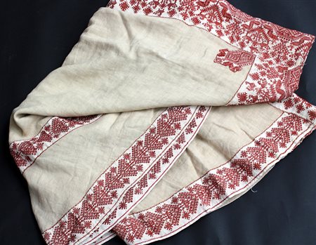 [Tappeti] Ricamo in seta rossa su tessuto ecrù in lino, Mar Egeo, metà secolo...