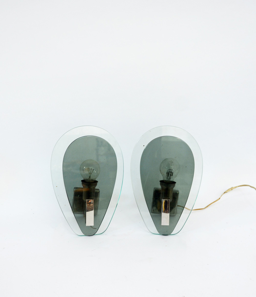 Coppia di appliques ad una fiamma in vetro e metallo anni 60 (h cm 24) (difetti)